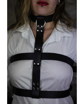 Arnês com três tiras de couro de 3 cm, ajusta-se ao corpo com fivelas.