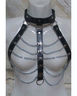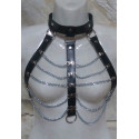 Arnês de couro com corrente ajustável no pescoço e nas costas.